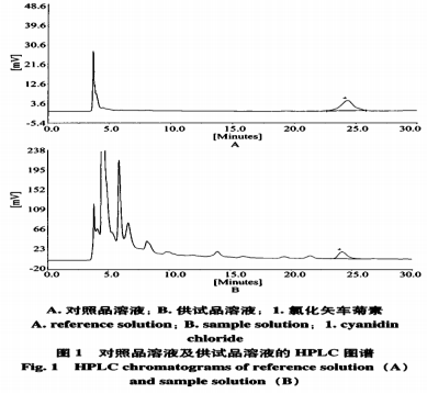 離子交換柱為大連市依利特ODS2C18(4.6mm×250mm,5μm);流動性相:A為工業(yè)甲醇,B為0.2%硫酸銨溶液(W),程序流程為0~30min,40%A;流動速度:0.8mL/min;柱溫:30℃;進樣量:20μL;檢驗光波長為276nm。鈦酸異丙酯矢車菊素的保存期為24.21min,理論塔板數(shù)為21917,與鄰近峰的分離度為2.28。HPLC色譜見圖1。