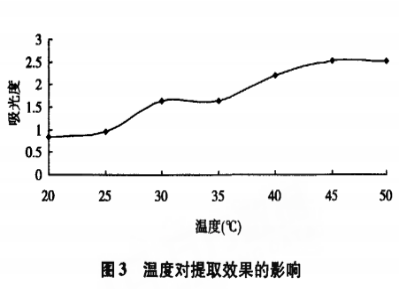稱量同樣品質(zhì)的西紅柿渣5份,以乙醚為萃取法劑,在液料比(g∶mL)為4∶1、溫度各自為20℃、25℃、30℃、35℃、40℃、45℃、50℃的標準下萃取法4h,在484nm光波長下測量萃取法液的OD值,結(jié)果如圖所示3所顯示。