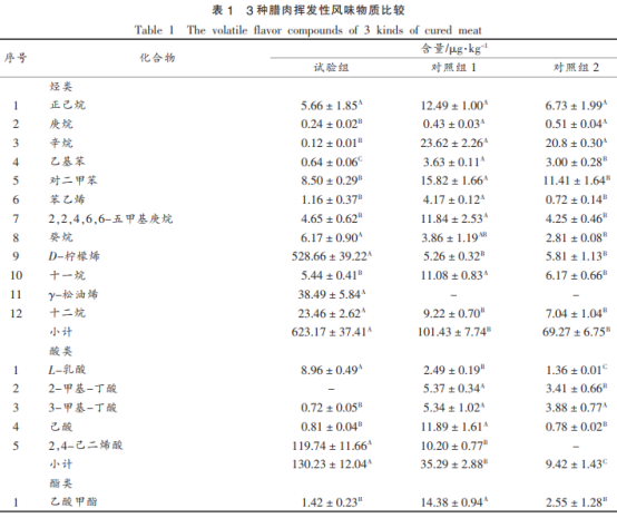 實(shí)驗(yàn)組中國(guó)共產(chǎn)黨評(píng)定出揮發(fā)物成份71種,總成分為2939.68μg/kg,在其中醚類(lèi)(982.22μg/kg)、氮化合物(623.17μg/kg)、代烴(456.53μg/kg)為關(guān)鍵揮發(fā)物成份。對(duì)照實(shí)驗(yàn)1中國(guó)共產(chǎn)黨評(píng)定出揮發(fā)物成份64種,總成分為1636.28μg/kg,在其中大環(huán)內(nèi)酯(479.50μg/kg)、代烴(445.65μg/kg)、醛類(lèi)(316.46μg/kg)為關(guān)鍵揮發(fā)物成份。對(duì)照實(shí)驗(yàn)2中國(guó)共產(chǎn)黨評(píng)定出揮發(fā)物成份66種,總成分為667.15μg/kg,在其中大環(huán)內(nèi)酯(382.62μg/kg)、代烴(92.23μg/kg)、氮化合物(69.27μg/kg)為關(guān)鍵揮發(fā)物成份。綜上所述得知,實(shí)驗(yàn)組里揮發(fā)物成份的類(lèi)別和總成分均為最大。Sidira等發(fā)覺(jué)運(yùn)用干酪乳桿菌ATCC393發(fā)醇臘腸能明顯提升臘腸揮發(fā)物口味化學(xué)物質(zhì)的類(lèi)別與成分;潘曉倩等將乳酸菌10M-7加上到吹干臘腸中,明顯改進(jìn)和提升風(fēng)干腸的口味。這表明實(shí)驗(yàn)組選用RC4和B6發(fā)醇能推動(dòng)咸肉口味化學(xué)物質(zhì)類(lèi)別和成分的提升。除此之外,臘肉制作全過(guò)程中腌漬是必需階段,腌漬全過(guò)程還可以具有抗菌防腐蝕的作用,與此同時(shí)還可以提升咸肉的保水溶性,提升咸肉產(chǎn)品的顏色和口味。實(shí)驗(yàn)組腌漬環(huán)節(jié)中增加的紅曲紅與甜菜紅,維生素E和各種各樣調(diào)味料在取代亞硝酸鈉的與此同時(shí),還能提高肉的口味,提升企業(yè)產(chǎn)品的吃用使用價(jià)值。