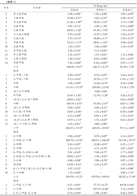 表明對(duì)照實(shí)驗(yàn)1和對(duì)照實(shí)驗(yàn)2的整體味道比較類(lèi)似。為進(jìn)一步研究3種咸肉味道成份的區(qū)別,選用頂空進(jìn)樣器固相微提純-氣質(zhì)聯(lián)用儀技術(shù)性對(duì)3種咸肉中的揮發(fā)成份開(kāi)展評(píng)定。
