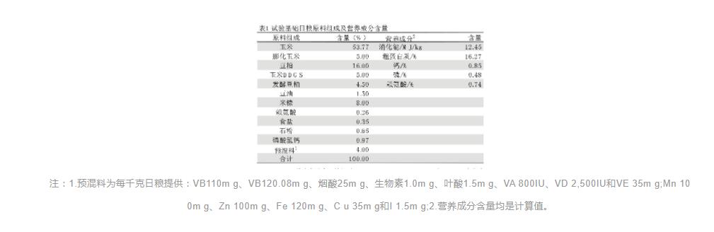實(shí)驗(yàn)挑選100頭身心健康、休重相仿的“杜×長(zhǎng)×大”生長(zhǎng)發(fā)育育肥豬,依照單要素隨機(jī)分組標(biāo)準(zhǔn),分為4個(gè)解決組,每一組5個(gè)反復(fù),每一個(gè)反復(fù)5頭豬。對(duì)照實(shí)驗(yàn)喂養(yǎng)基本日糧,實(shí)驗(yàn)1~3組先后在基本日糧中加上0.5%、1.0%、1.5%的中草藥材添加物,試驗(yàn)期4周。實(shí)驗(yàn)基本日糧原材料構(gòu)成及營(yíng)養(yǎng)元素成分如下所示表1所顯示。