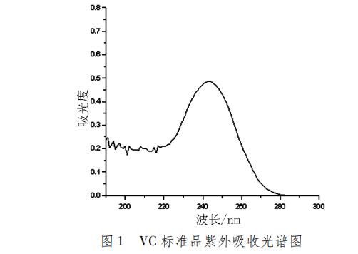 由圖1及圖2能夠 看得出維他命C標(biāo)準(zhǔn)物質(zhì)的λmax=243nm,新鮮水果試品的λmax=244nm,他們的最高消化吸收光波長(zhǎng)基本上一致,這表明維他命C在酸性溶液中的最高消化吸收光波長(zhǎng)為243nm。