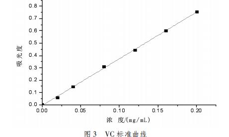 本試驗(yàn)選用紫外線-由此可見光度法對(duì)VC的成分開展了測(cè)量,將1mg/mL的VC規(guī)范貯備液梯度方向稀釋液為0.02,0.04,0.08,0.12,0.16,0.20mg/mL的系列產(chǎn)品水溶液各自檢驗(yàn)其OD值。以濃度值為橫坐標(biāo)軸,OD值為縱軸制作維他命C標(biāo)曲(見圖3)。
