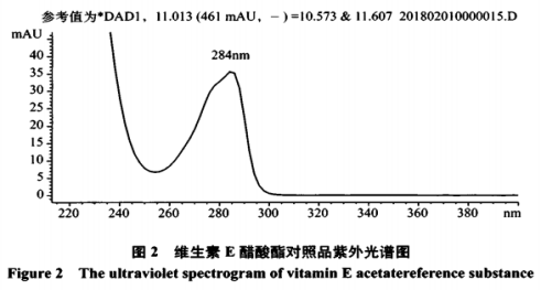 將維生素E冰醋酸酯標(biāo)準(zhǔn)品水溶液引入液相色譜(配置DAD紫外線探測(cè)器),打開(kāi)光譜儀收集,在主成份峰部位觀查較大消化吸收光波長(zhǎng)(見(jiàn)圖2)。結(jié)果顯示:維生素E冰醋酸酯標(biāo)準(zhǔn)品的最高消化吸收光波長(zhǎng)與檢驗(yàn)光波長(zhǎng)284nm一致。