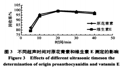 本實(shí)驗(yàn)與此同時(shí)調(diào)查5個(gè)不一樣超聲波獲取時(shí)間,各自為5min,10min,20min,30min,40min,對(duì)花青素及維生素E加標(biāo)試品的獲取實(shí)際效果,利用率隨時(shí)長(zhǎng)轉(zhuǎn)變關(guān)聯(lián)如圖所示3。