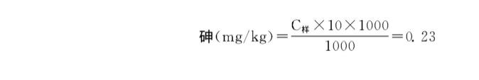 荼葉試品采自金華市龍?zhí)赌巢鑸?chǎng),一樣情況下,依據(jù)砷試品OD值與標(biāo)液工作中曲線圖測(cè)量,測(cè)出A樣=0.030,由標(biāo)曲可獲得砷樣濃度值為:C樣=0.023μg/mL,根據(jù)試品加工處理方式10mL為1g試品。