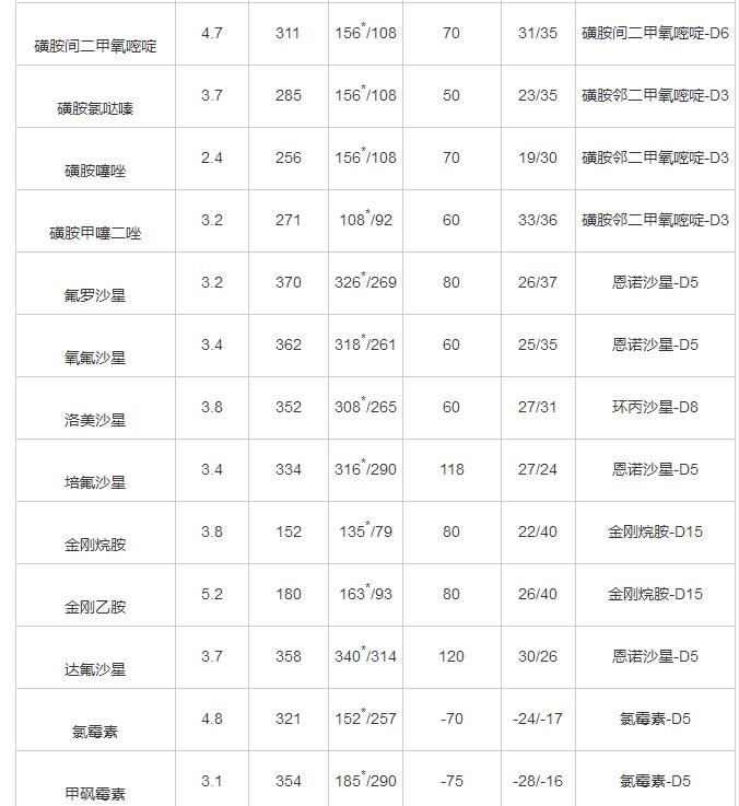 ESI離子源;離子源溫度550℃;噴霧器氣(GS1)工作壓力0.379MPa;輔助加溫氣(GS2)工作壓力0.379MPa;氣簾氣工作壓力0.241MPa;正、空氣負(fù)離子方式與此同時(shí)掃描儀,在其中氯霉素類藥為空氣負(fù)離子方式掃描儀,噴霧器工作電壓-4500V,多反映檢測方式(MRM);磺胺類、氟喹諾酮、金剛烷胺類為共價(jià)鍵方式掃描儀,噴霧器工作電壓5500V,多反映檢測方式,別的質(zhì)譜分析主要參數(shù)列于表1。