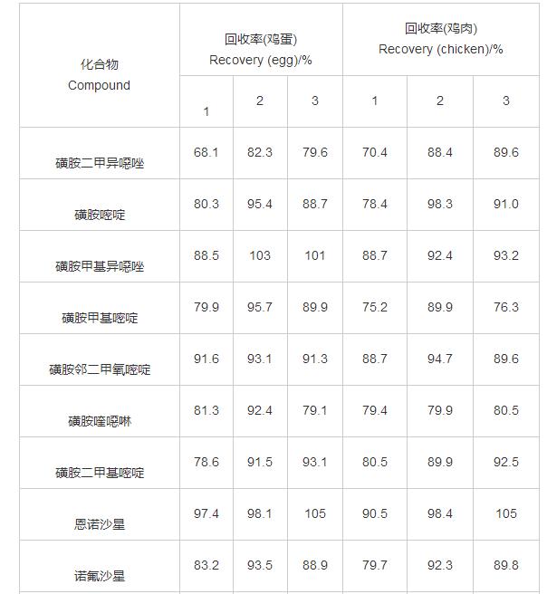 磺胺類(lèi)、喹諾酮類(lèi)藥物在生物內(nèi)易與蛋白質(zhì)融合造成很強(qiáng)的結(jié)合性,危害藥品的獲取高效率。若將乙腈立即添加高蛋白食物試品中會(huì)造成 蛋白大幅度轉(zhuǎn)性凝結(jié),使萃取液不可以充足觸碰藥品,獲取高效率稍低。但在添加乙腈前先添加一定容積和含量的酸或堿溶液,可毀壞這一結(jié)合性和細(xì)胞膜的結(jié)構(gòu),促進(jìn)結(jié)合態(tài)藥品離解為化合態(tài),充足釋放出來(lái)到萃取液中,且水解反應(yīng)后試品水分含量提升還可緩解蛋白的轉(zhuǎn)性速率,擴(kuò)大獲取實(shí)驗(yàn)試劑與藥品的觸碰總面積,提升藥品的獲取高效率;此外,酸、堿還能抑制化學(xué)物質(zhì)酸、堿基團(tuán)的離解,提升其遷移到乙腈層中的高效率。試驗(yàn)調(diào)查了向試品中添加同樣濃度值稀硫酸、氫氧化鈉、苯甲酸、磷酸氫二鉀水溶液水解反應(yīng)后藥品的獲取實(shí)際效果。結(jié)果顯示,堿溶液水解反應(yīng)的生雞蛋試品乳化現(xiàn)象較比較嚴(yán)重,乙腈與栽培基質(zhì)及水相無(wú)法分離出來(lái);而酸水解反應(yīng)的分層次不錯(cuò),在其中加硫酸的試樣中大部分藥品的利用率高些,對(duì)鹽酸濃度和容積提升后,明確以5mL2mol/L硫酸水解反應(yīng)試品。