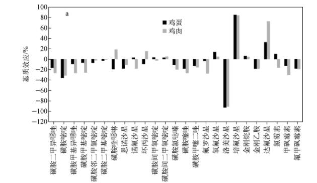 本試驗(yàn)調(diào)查了生雞蛋、雞脯肉試品水解反應(yīng)后,每一次添加15mL乙腈各自獲取1、2、3次后各藥品的利用率,結(jié)果列于表2。由此可見(jiàn),獲取1次一部分藥品及相對(duì)應(yīng)內(nèi)標(biāo)物的獲取高效率有很大差別,一部分藥品超過(guò)飼料殘余對(duì)利用率(70%~120%)的規(guī)定;獲取2次的利用率最好是;獲取3次的影響峰增加。因而,挑選每一次添加15mL乙腈反復(fù)獲取2次。