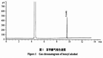苯甲醇在GC、HPLC、GC-MS三個系統(tǒng)軟件上的色譜見圖1~圖3。試品在總體目標峰部位沒有雜質影響。此外,調查了山梨酸、苯甲醛和苯甲醇三種成分的混和水溶液在三個系統(tǒng)軟件中的分離出來實際效果,結果分離度均超過1.5,達到系統(tǒng)軟件適用范圍的規(guī)定。
