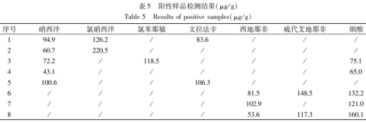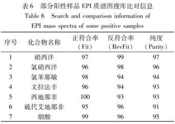 選用本方式對50批號消除疲勞類和提高睡眠質(zhì)量類保健產(chǎn)品開展檢驗,外標(biāo)法定量分析。試驗數(shù)據(jù)顯示,驗出呈陽性試品共8批號,定量分析結(jié)果見表5。每批號呈陽性試品最少與此同時驗出二種違規(guī)加上藥品,在其中驗出數(shù)最多的化學(xué)物質(zhì)是硝西泮和炯酸,各驗出5批號,次之是他達(dá)那非,共驗出3批號,氯硝西泮、文法拉辛、硫代艾地那非各驗出2批號,氯苯那敏驗出1批號。全部呈陽性試品EPI譜圖均歷經(jīng)EPI數(shù)據(jù)庫查詢(2.3)核對確診,以Fit、RevFit和Purity三個主要參數(shù)表明查找結(jié)果,其標(biāo)值反映與總體目標(biāo)化學(xué)物質(zhì)的搭配水平。在其中FiL(F)意味著正符合率,即標(biāo)準(zhǔn)物質(zhì)譜峰與試品譜峰的相似性,最高值為100,值越大表明是該化學(xué)物質(zhì)的概率越大;RevFit(R)意味著反符合率,即試品譜圖與標(biāo)準(zhǔn)物質(zhì)譜圖的相似性;Purity(P)意味著純凈度,是綜合性前二種結(jié)果得到的標(biāo)值,即試品譜圖與數(shù)據(jù)表中的標(biāo)準(zhǔn)物質(zhì)譜圖之問在質(zhì)量數(shù)、進化速率等主要參數(shù)層面的相似性。EPI數(shù)據(jù)庫查詢搜庫結(jié)果中總體目標(biāo)化學(xué)物質(zhì)依照P值從大到小的排列順序;一部分呈陽性試品質(zhì)譜分析對比分析見圖3。