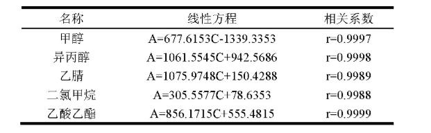 結(jié)果顯示,工業(yè)甲醇,等保,乙腈,二氯甲烷,乙酸丁酯在一定區(qū)域內(nèi),峰總面積與濃度值均成較好的線性相關(guān)。