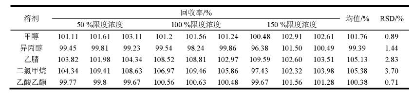 實驗結(jié)果顯示,各有機溶劑在定量限濃度值下反復(fù)氣相檢驗,峰總面積RSD<10.0%,保存期RSD≥1.0%,說明本方式氣相精度優(yōu)良。