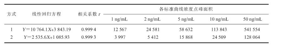 在痕量元素剖析中,試品前處理方式經(jīng)常隨著著總體目標(biāo)物的損害,危害解析結(jié)果的精確性,放射性核素內(nèi)標(biāo)法可合理減少這一危害,但放射性核素內(nèi)標(biāo)通常價(jià)格比較貴,大幅度提高了實(shí)驗(yàn)成本費(fèi)。因而,選用這兩種形式開展定量分析。方法1選用外標(biāo)法,參照財(cái)政部1031號(hào)公示-2-2008規(guī)范[19]規(guī)定,精確移取阿昔洛韋規(guī)范貯備液,以20%乙腈溶液稀釋液,配置成含量為1、2、5、10、50 ng/m L的系列產(chǎn)品濃度值規(guī)范切削液;方法2選用標(biāo)準(zhǔn)加入法,依照本實(shí)驗(yàn)上述標(biāo)液的配置流程實(shí)際操作。將2組規(guī)范切削液上機(jī)操作檢驗(yàn),以總體目標(biāo)化學(xué)物質(zhì)峰總面積(Y)與濃度值(X)開展回歸分析,制作標(biāo)曲,結(jié)果見表2。