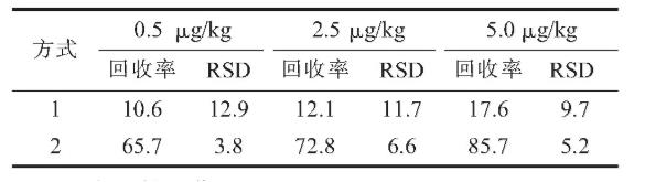 由表2得知,二種標(biāo)曲制作方法的線性相關(guān)優(yōu)良,但各濃度值點(diǎn)峰總面積區(qū)別很大,方法1是方法2相匹配規(guī)范濃度值點(diǎn)峰總面積的3~5倍,說明受試品前處理方式的危害,總體目標(biāo)物損害比較顯著。為進(jìn)一步認(rèn)證二種標(biāo)曲制作方法的適用范圍,在線形范疇內(nèi)挑選0.5、2.5、5.0μg/kg水準(zhǔn)加標(biāo)濃度值(每一個(gè)濃度值點(diǎn)平行測(cè)定6次),依照本實(shí)驗(yàn)所挑選的固相萃取法實(shí)現(xiàn)前解決后上機(jī)操作檢驗(yàn),各自帶入以上兩根標(biāo)曲開展線性擬合,考察利用率和相對(duì)性相對(duì)標(biāo)準(zhǔn)偏差,結(jié)果見表3。