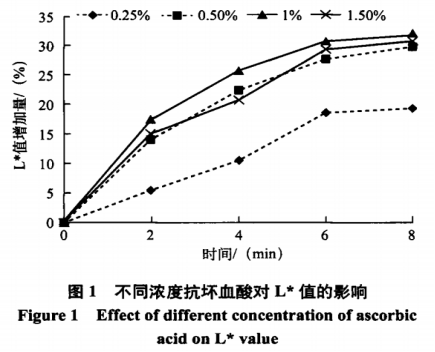 如圖所示l所顯示,與解決前對(duì)比,不一樣含量的抗壞血酸水溶液均有提升L*值的實(shí)際效果。且伴隨著水溶液 濃度值的提升,L*值提高力度展現(xiàn)先提高后減小的 發(fā)展趨勢(shì),即0.25%~1%范疇內(nèi),在解決時(shí)間同樣 時(shí),L*值提升力度伴隨著抗壞血酸濃度值的提高而增 加;1%~1.5%范疇內(nèi),L*值提升力度伴隨著抗 壞血酸濃度值的提高而減少。在0~6min內(nèi),伴隨著解決時(shí)長(zhǎng)的增加,不一樣含量的抗壞血酸水溶液對(duì) L*值的提升力度不一樣,在其中以1%抗壞血酸水溶液 使L*值的提升力度較大,為30.52%,1.5%抗壞 血酸實(shí)際效果其次,為29.19%;解決的時(shí)間超出6min 后,L*值變化量曲線(xiàn)圖轉(zhuǎn)變較為輕緩,不會(huì)再提升, 表明不一樣含量的抗壞血酸水溶液對(duì)南湖菱表層褐黑色 色附屬物的處置功能在6min上下做到較大。