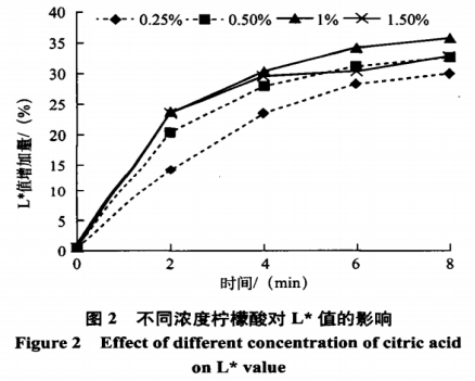 如圖4所顯示,不一樣含量的L一胱胺酸均有提高L*值的實(shí)際效果,在其中,0.25%濃度值的L一胱胺酸對(duì)L*值的提升實(shí)際效果最爛,解決完畢后僅為2.24%,差別明顯(p<0.05)。與0.25%濃度值組對(duì)比,濃度值為0.50%、1.00%、1.50%的L一胱胺酸水溶液對(duì)L*值的提升實(shí)際效果伴隨著解決時(shí)長(zhǎng)的增加而提升,到第六mill時(shí),L*值的提升力度顯著降低,表明不一樣含量的L一胱胺酸水溶液對(duì)南湖菱表層深褐色附屬物的處置功能在6min上下做到較大;解決完畢時(shí)L*值的提升力度分別為2.89%、2.90%、2.92%,差別不明顯(P>0.05)。