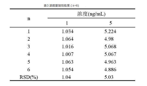 對(duì)濃度值為1ng/mL和5ng/mL的規(guī)范切削液,各自持續(xù)測量6次,調(diào)查儀器設(shè)備的精度,峰總面積的可重復(fù)性結(jié)果如表3。數(shù)據(jù)顯示,1ng/mL、5ng/mL標(biāo)準(zhǔn)物質(zhì)的含量相對(duì)性相對(duì)標(biāo)準(zhǔn)偏差(RSD%)各自為1.04%和5.03%,儀器設(shè)備精度優(yōu)良。