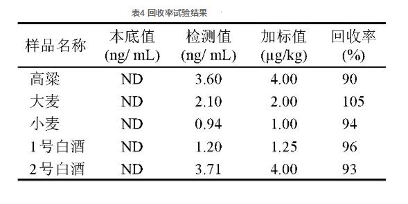 在釀造原材料及純糧酒中添加一定量的13C17-AFTB1放射性核素內(nèi)標(biāo)和AFTB1正中間規(guī)范液(100ng/mL),獲得不一樣含量的加標(biāo)試品,再依據(jù)1.4的辦法開展試品的解決,測量其利用率如表4。制酒原材料高粱米、麥籽、麥子及純糧酒的利用率都是在90%~105%中間,徹底符合規(guī)定。