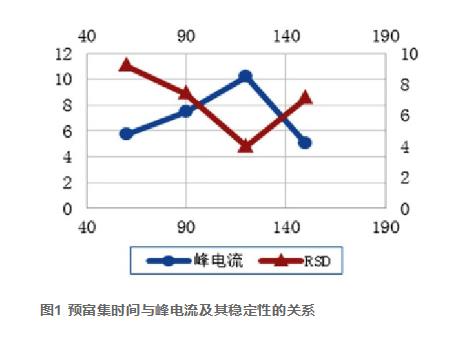 參照《化學(xué)試劑陽極溶出伏安法通則》(GB/T3914-2008)的要求,預(yù)電解法聚集時(shí)間不少于1min,不超過10min,在測(cè)量全過程中此值應(yīng)保證穩(wěn)定。各自對(duì)含鎘濃度值為4μg·L-1的試樣開展不一樣聚集時(shí)間的6次測(cè)量,由圖1得知,在其它情況一樣的情形下,選用聚集時(shí)間為120s峰電流量敏感度高、RSD較小,因而,本方式選用的預(yù)聚集時(shí)間為120s。