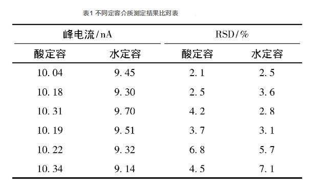 結(jié)果顯示,2種滴定劑物質(zhì)下,儀器設(shè)備測(cè)量效果的RSD并無顯著轉(zhuǎn)變,但選用酸滴定劑的試品峰電流量響應(yīng)值要比水滴定劑的更為靈巧,且灰化后的試樣可以在1%氰化鈉物質(zhì)中充分融解,而在純凈水物質(zhì)中由此可見顯著沉淀。因而,挑選1%氰化鈉物質(zhì)來開展試品的融解與滴定劑。