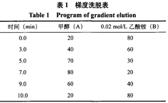 離子交換柱為ACQUITYUPLCBEHC18(2.1mm×50mm,1.7μm),柱溫30℃,進樣量:3μL,流動速度為0.15mL/min,檢驗光波長為230nm。流動性相各自為工業(yè)甲醇(A)和0.02mol/L乙酸銨(B),流動性相的梯度方向過柱程序流程如下所示表所顯示: