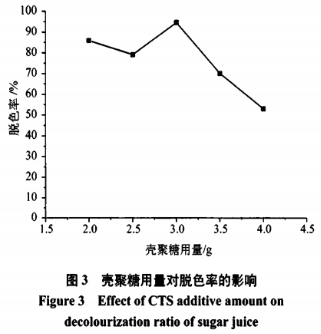 圖3為反映殼聚糖使用量與褪色率的關(guān)系圖。圖上可清晰看得出,糖汁褪色率在殼聚糖使用量為3.0g時(shí)褪色率做到較大,表明在這里使用量時(shí)殼聚糖與蒙脫土的復(fù)合型實(shí)際效果不錯(cuò),殼聚糖的承載量較高;但伴隨著殼聚糖的劑量再次提升,褪色率極速降低,導(dǎo)致這個(gè)情況很有可能出現(xiàn)的緣故為:反映用殼聚糖量太多,管理體系粘度大,對(duì)反映也不好,導(dǎo)致殼聚糖在蒙脫土上的合理承載量減少。因而,殼聚糖的使用量以3.0g為最好。