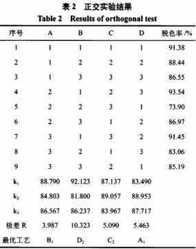 由表2偏差剖析得知,危害褪色率的要素次序次序?yàn)椋築>D>C>A,其最好工藝技術(shù)標(biāo)準(zhǔn)為:B1D2C2A1,即反應(yīng)速度4h、甲酸濃度值1.5%、殼聚糖的使用量2.5g、反映溫度40℃。依據(jù)組成標(biāo)準(zhǔn)B1D2C2A1開展三次認(rèn)證試驗(yàn),獲得糖汁褪色率均值為94.71%,最好工藝技術(shù)標(biāo)準(zhǔn)獲得認(rèn)證。比照有關(guān)參考文獻(xiàn),本實(shí)驗(yàn)操作的糖汁褪色率高些,而反應(yīng)速度降低了2h,甲酸濃度值提升了0.5%,殼聚糖的使用量降低了0.5g,反映溫度由60℃降至了40℃,制取加工工藝標(biāo)準(zhǔn)獲得了提升。