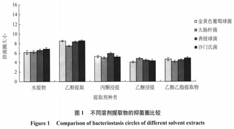 本試驗(yàn)各自選用華北地區(qū)車后水提物、酒精提取液、甲苯提取液、醫(yī)用乙醚提取液和乙酸丁酯提取液,其對(duì)橙黃色鏈球菌、大腸埃希菌、大腸埃希氏菌、沙門菌開展抗菌試驗(yàn)較為。4種菌苗各自做三組平行面對(duì)比,恒溫培養(yǎng)箱塑造24h,比照其抗菌活力尺寸,紀(jì)錄抑菌圈的尺寸,如圖所示1所顯示。