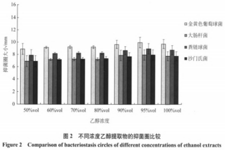 結(jié)果如圖2所顯示,七個(gè)濃度值的乙醇溶液的提取液對(duì)橙黃色鏈球菌、大腸埃希菌、大腸埃希氏菌、沙門菌具備不一樣水平的抑制效果。95%vol酒精提取液對(duì)橙黃色鏈球菌直徑為9.82mm~9.855mm,有較強(qiáng)抑制效果,抗菌實(shí)際效果不錯(cuò);90%vol及其95%vol酒精提取液對(duì)大腸埃希菌直徑為8.94mm~8.62mm,有較強(qiáng)抑制效果,抗菌實(shí)際效果不錯(cuò);90%vol及其95%vol酒精提取液對(duì)糞鏈球菌直徑為7.62mm~7.86mm,有較強(qiáng)抑制效果,抗菌實(shí)際效果不錯(cuò);95%vol酒精提取液對(duì)沙門菌有較強(qiáng)抑制效果,抗菌實(shí)際效果不錯(cuò);因此整體而言以不一樣濃度值酒精來(lái)獲取,95%vol的酒精提取液濃度值的抗菌實(shí)際效果最好。