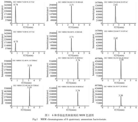 季銨鹽易喪失鹵素?zé)襞菡x子獲得共價鍵,故挑選EST 方式開展掃描儀。將配置好的各季銨鹽抗菌劑標(biāo)液根據(jù)針泵引進(jìn)的方法引入離子源開展離子化,首先用Ql全掃捕明確標(biāo)準(zhǔn)物質(zhì)中總體目標(biāo)物的[M-X] 的母正離子峰,調(diào)節(jié)流動速度、通道工作電壓(entrancev01tage,EV)、水解工作電壓等主要參數(shù)使母正離子峰做到最高值,再用子離子逐行掃描,更改撞擊工作電壓(c011isionv01tage,CE)值,挑選倆對數(shù)據(jù)信號最強(qiáng)、最平穩(wěn)的子離子做為判定定量分析正離子,提升其撞擊動能,使離子對的接收靈敏度做到最高值,明確好之上主要參數(shù)后,選用多反映峪測方式(multiplereactionmonitoring,MRM)開展檢驗(yàn),各子離子的停留時問為100ms。最后在提升的色譜儀、質(zhì)譜分析標(biāo)準(zhǔn)下,獲得如圖所示1所顯示的各國家標(biāo)準(zhǔn)物質(zhì)濃度值為10μg/L時的多反映檢測色譜。TAC出峰快,保存期0.74min,BDAB保存期2.71min,DTAC保存期2.42min,TDBAC保存期3.19min,BDHAC保存時問3.74min,DDAC保存時問3.30min,六種季銨鹽類抗菌劑在提升的標(biāo)準(zhǔn)下分離出來效果非常的好,峰形對稱性。