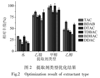 根據(jù)對6種季銨鹽類抗菌劑的正負(fù)極調(diào)查,實(shí)驗(yàn)了水、乙腈、工業(yè)甲醇和酒精4種極性溶劑對目的物的獲取實(shí)際效果。結(jié)果如圖2所顯示,在其中水和酒精的獲取實(shí)際效果比較不佳,乙腈的獲取工作能力好于水和酒精,工業(yè)甲醇對6種季銨鹽抗菌劑的獲取實(shí)際效果最好,可能是工業(yè)甲醇本身優(yōu)良的透水性和適宜的正負(fù)極促使其對目的物獲取工作能力較強(qiáng)。