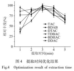 獲取時(shí)問就是指獲取劑和試品觸碰后從超聲波丌始到完成的時(shí)間,獲取時(shí)問過短,獲取小夠充足;獲取時(shí)問太長會帶到太多影響化學(xué)物質(zhì)與此同時(shí)工業(yè)甲醇很有可能蒸發(fā)較多,減少獲取高效率,消耗的時(shí)長和動能太多。本科學(xué)研究調(diào)查了獲取時(shí)問為1、2、3、4和5min時(shí)的獲取實(shí)際效果,結(jié)果如圖所示4所顯示,試驗(yàn)發(fā)覺當(dāng)獲取時(shí)問為3min時(shí)作用最好??偟膩碚f,選擇3min為最好獲取時(shí)間。