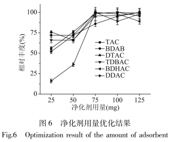 吸收劑使用量的幾個關(guān)聯(lián)著影響成分的危害是不是獲得最高程度上的減少,本科學(xué)研究進(jìn)一步調(diào)查了PSA使用量為25、50、75、100、125mg時(shí)的獲取實(shí)際效果,結(jié)果如圖所示6所顯示。試驗(yàn)發(fā)覺75mg時(shí)6種抗菌劑季銨鹽均獲得較好的回收利用實(shí)際效果,伴隨著使用量再次提升,獲取實(shí)際效果沒有顯著轉(zhuǎn)變,敝選擇75mgPSA為本辦法的最后提升標(biāo)準(zhǔn)。