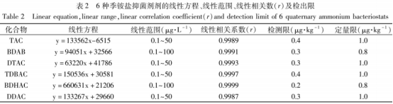 配置濃度值為0.1、0.5、1、5、10、50、100μg/L的6種季銨鹽抑蔭劑系列產(chǎn)品混和標(biāo)液,在提升的試驗(yàn)標(biāo)準(zhǔn)下檢測,以獲取日標(biāo)正離子的峰總面積v對相對的濃度值x(μg/L)開展線形同歸,制作標(biāo)曲(見表2),其相關(guān)系數(shù)r均超過0.9987,說明6種抗菌劑在0.1~100μg/L范同的線性相關(guān)優(yōu)良。以定量分析正離子的3倍頻率穩(wěn)定度(S/N=3)的響應(yīng)值相匹配的化學(xué)物質(zhì)濃度值做為設(shè)備的方法檢出限(1imitofdetection,LOD),以10倍頻率穩(wěn)定度(S/N=10)測算儀器設(shè)備的定量限(1imitofquantitation,TOQ)。6種抗菌劑方法檢出限0.2~0.4μg/kg,定量限0.8~1.0μg/kg。