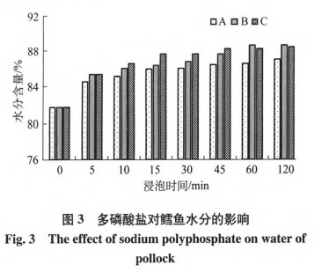 針對銀鱈魚來講,應(yīng)用較低濃度的泡浸計(jì)劃方案A,泡浸120min,水份占比為87%,銀鱈魚中聚磷酸鹽含量為5.016g/kg;應(yīng)用中濃度值的泡浸計(jì)劃方案B,泡浸30min時,水份占比為86.7%,銀鱈魚中聚磷酸鹽含量為5.mg/kg;應(yīng)用濃度較高的的泡浸計(jì)劃方案C;泡浸10min時,水份占比為86.5%,銀鱈魚中聚磷酸鹽含量為5.230g/kg。