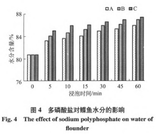 針對鰈魚來講,應(yīng)用較低濃度的泡浸計(jì)劃方案A,泡浸60min,水份占比為86%,鰈魚中聚磷酸鹽含量為5.110g/kg;應(yīng)用中濃度值的泡浸計(jì)劃方案B,泡浸30min,水份占比為86%,鰈魚中聚磷酸鹽含量為5.014g/kg;應(yīng)用濃度較高的的泡浸計(jì)劃方案C,泡浸10min,水份占比為86%,鰈魚中聚磷酸鹽含量為4.991g/kg。