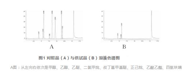 高精密稱量工業(yè)甲醇、酒精、醫(yī)用乙醚、二氯甲烷、叔丁基羥基醚、正己烷、乙酸丁酯、四氫呋喃適當(dāng),用空缺有機溶劑(80% N,N-二甲基甲酰胺溶液,下列同樣)稀釋液做成每1 ml大約含工業(yè)甲醇1.5 mg、酒精2.5 mg、醫(yī)用乙醚2.5 mg、二氯甲烷0.3 mg、叔丁基羥基醚2.5 mg、正己烷0.145 mg、乙酸丁酯2.5 mg、四氫呋喃0.36 mg的混和水溶液做為標(biāo)準(zhǔn)品貯備液。高精密量取標(biāo)準(zhǔn)品貯備液1 ml, 置10 ml量瓶中,用空缺有機溶劑稀釋液至標(biāo)尺,混勻即得標(biāo)準(zhǔn)品水溶液。