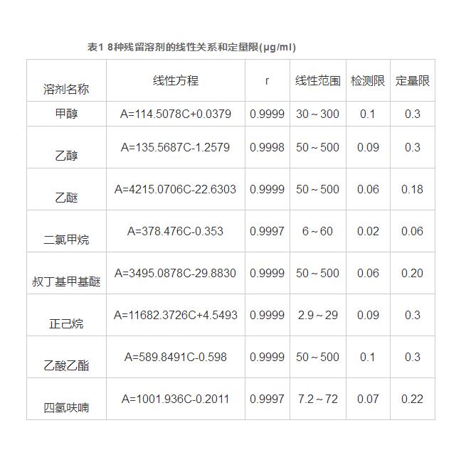 高精密量取“2.2.1”項下標(biāo)準(zhǔn)品水溶液2 ml, 反復(fù)頂空進(jìn)樣器氣相10次,按“2.1”項下色譜儀標(biāo)準(zhǔn)測量峰總面積。結(jié)果工業(yè)甲醇、酒精、醫(yī)用乙醚、二氯甲烷、叔丁基羥基醚、正己烷、乙酸丁酯、四氫呋喃峰總面積的RSD各自為0.98%、1.03%、0.87%、1.04%、1.11%、0.95%、0.99%、1.18%,說明儀器設(shè)備精度優(yōu)良。