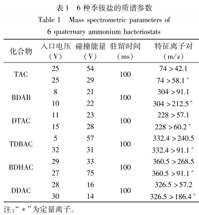 PerkinElmerQsight系列產(chǎn)品三重四級(jí)桿質(zhì)譜分析安裝EST水解源,選用正源方式;離子化工作電壓4000V;離子源溫度350℃;反吹風(fēng)干躁氣100μL/min;做霧化氣180μL/min;人口數(shù)量工作電壓、撞擊動(dòng)能、特點(diǎn)離子對(duì)見(jiàn)表1;常用汽體均為高純度氮。