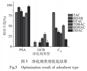 本分析選擇的獲取方法是超聲波輔助提純,超音波發(fā)生的輻射源氣體壓強(qiáng)、空化效應(yīng)及振動(dòng)分析等在試品和獲取劑之問造成了聲波頻率空蝕功效。,提升了觸碰而積,加速對(duì)流傳熱速率。食品包裝材料拿紙中包含各種各樣食品添加劑和印刷油墨,超聲波獲取抗壓強(qiáng)度比較大,如果不應(yīng)用凈化劑凈化處理,則難以避免地導(dǎo)致很強(qiáng)的栽培基質(zhì)抑制效應(yīng),進(jìn)而危害檢查結(jié)果。本分析參照農(nóng)殘檢測(cè)中精選的QuEChERS方式,科學(xué)研究了GCB、PSA、C18三種凈化劑的清潔實(shí)際效果,試驗(yàn)發(fā)覺GCCB和C18對(duì)季銨鹽抗菌劑均有不一樣水平的吸咐,在其中CCB基本上吸咐了全部的BDAB,而應(yīng)用PSA時(shí),試驗(yàn)得到了不錯(cuò)的獲取實(shí)際效果,故試驗(yàn)最后選擇PSA做為凈化劑,其效果如圖所示5所顯示。