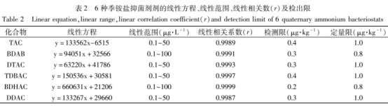 配置濃度值為0.1、0.5、1、5、10、50、100μg/L的6種季銨鹽抗菌劑系列產(chǎn)品混和標(biāo)液,在提升的試驗(yàn)標(biāo)準(zhǔn)下檢測(cè),以獲取日標(biāo)正離子的峰總面積y對(duì)相對(duì)的濃度值x(μg/L)開展線形同歸,制作標(biāo)曲(見表2),其相關(guān)系數(shù)r均超過0.9987,說明6種抗菌劑在0.1~100g/L范同的線性相關(guān)優(yōu)良。以定量分析正離子的3倍頻率穩(wěn)定度(S/N=3)的響應(yīng)值相匹配的化學(xué)物質(zhì)濃度值做為設(shè)備的方法檢出限(1imitofdetection,LOD),以l0倍頻率穩(wěn)定度(S/N=10)測(cè)算儀器設(shè)備的定量限(1imitofquantitation,LOQ)。6種抗菌劑方法檢出限0.2~0.4μg/kg,定景限0.8~1.0μg/kg。