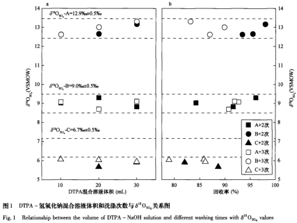 依據(jù)上述情況實(shí)驗(yàn)方案設(shè)計(jì)規(guī)定,在A、B和C硫酸鋇試品中分別添加10mL、20mL和30mL的DTPA-氫氧化鈉溶液混和水溶液,并分別用純凈水清洗2次和3次,測量干躁后硫酸鋇的氧放射性核素值,并與沒經(jīng)提純解決的硫酸鋇氧放射性核素值實(shí)現(xiàn)較為,結(jié)果如圖所示1所顯示。由圖1能夠 看得出,高純度實(shí)驗(yàn)試劑硫酸鋇(A和B)經(jīng)不一樣容積DTPA-氫氧化鈉溶液混和水溶液解決并清洗后,其δ18OSO4,值與原試品δ18OSO4值差別不顯著,均落在原試品δ18OSO4值偏差范疇內(nèi),表明硫酸鋇標(biāo)準(zhǔn)物質(zhì)A和B中的磷酸鹽等雜物的含量很低,處理方式對其δ18OSO4值危害并不大,能夠同時(shí)做為試驗(yàn)室國家標(biāo)準(zhǔn)物質(zhì)應(yīng)用。