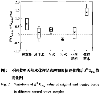 選用以上明確的最好提純程序流程,對不一樣種類水質(zhì)試品解決后獲得的硫酸鋇固態(tài)開展提純,比照解決前后左右硫酸鋇δ18OSO4值轉(zhuǎn)變狀況。如圖2所顯示,肥皂粉試品解決前后左右硫酸鋇的δ18OSO4值差別范疇為0.3‰~1.0‰,平均值0.7‰(n=2);地表水試品解決前后左右硫酸鋇的δ18OSO4值差別范疇為-0.4%o~0.5‰,平均值0.2‰(n=5);河流試品解決前后左右硫酸鋇的δ18OSO4值差別范疇為0.1‰~0.5‰,平均值0.3‰(n=6);廢水試品解決前后左右硫酸鋇的δ18OSO4值差別范疇為-0.2‰~-0.3‰,平均值0.3‰(n=3);化學(xué)農(nóng)藥試品解決前后左右硫酸鋇的δ18OSO4值差別范疇為-0.2‰~0.4‰,平均值0.1‰(n=3);降水試品解決前后左右硫酸鋇的δ18OSO4值差別范疇為0.5‰~1.9‰,平均值1.4‰(n=6)。