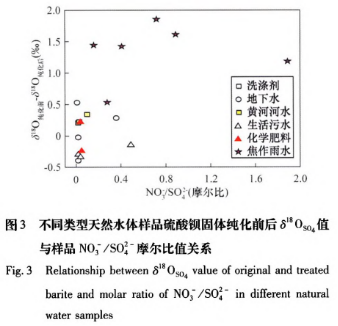 在其中,降水試品提純前后左右硫酸鋇的δ18OSO4值差別較大,表明提純?nèi)^程去除開降水試品硫酸鋇沉積中δ18OSO4值較高的殘?jiān)?,如磷酸鹽。廢水試品的占δ18OSO4差別數(shù)值負(fù)數(shù),解決后硫酸鋇δ18OSO4值有一定的擴(kuò)大,表明提純?nèi)^程去除開廢水試品硫酸鋇沉積中δ18OSO4值較低的殘?jiān)?,如有機(jī)化合物。地表水、河流和化學(xué)農(nóng)藥試品解決前后左右硫酸鋇的δ18OSO4值轉(zhuǎn)變在偏差容許標(biāo)準(zhǔn)內(nèi)(±0.5‰),表明這三類試品中的亞硝酸鹽和物質(zhì)等有機(jī)物的含水量低,對硫酸鋇沉積的影響并不大。肥皂粉解決后硫酸鋇的占δ18OSO4值有比較大減少,表明肥皂粉解決獲得的硫酸鋇固態(tài)中磷酸鹽成分不可忽