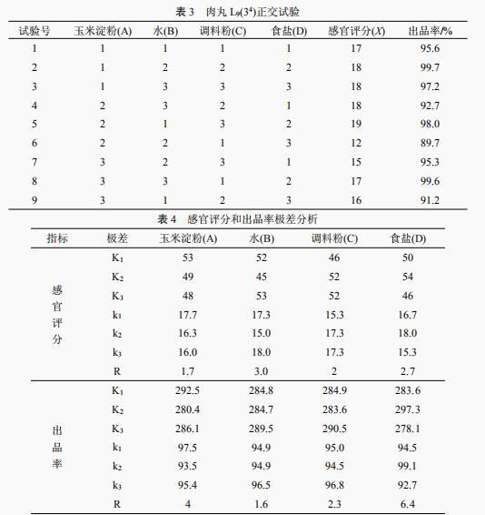 4要素3水準正交和試驗的商品感觀得分和榮譽出品率結(jié)果如表3所顯示,偏差剖析如表4所顯示。