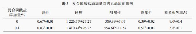 由表5得知,復(fù)合磷酸鹽加上量越大,豬肉丸的咬合性、強度、延展性、膠粘性標值越大,當復(fù)合磷酸鹽的增加量為0.3%~0.4%時,各特性綜合性最好是。蒸制損率伴隨著復(fù)合磷酸鹽加上量提升而減少,加上量為0.3%時,蒸制損率降至不大。因此,綜合性考慮到,復(fù)合磷酸鹽的適宜加上量為0.3%±0.05%。