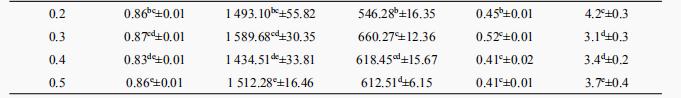 谷氨酰胺谷丙轉(zhuǎn)氨酶的加上實驗結(jié)果如表8所顯示。由表8得知,當TG酶加上量為0.4%~0.5%時,各特性差距不明顯(p>0.05);當加入量為0.1%時,肉丸子的蒸制損率與對仍然差別明顯(p<0.05)。當加入量為0.3%時,蒸制損率最少,為5.7%。因而谷氨酰胺谷丙轉(zhuǎn)氨酶的適宜加上量為0.3%±0.05%。