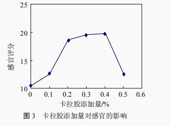 由圖2得知,當加入量為0.1%時,肉丸子的感覺點評評分與對照實驗的差別不顯著(p>0.05);當加入量為0.2%~0.4%時,感觀得分有漸漸提升的發(fā)展趨勢。