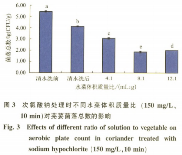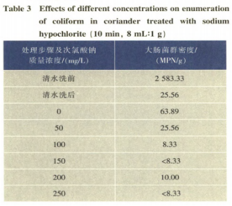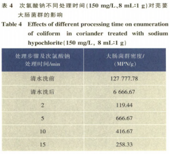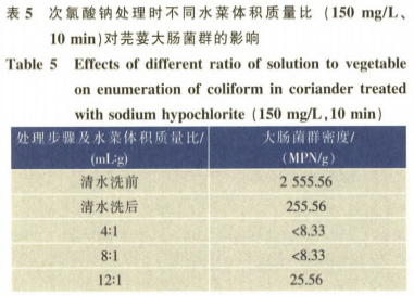 表3-表5各自為氫氧化鈣不一樣濃度值(水菜容積質(zhì)量比8m1:1g、10min)、不一樣解決時問(濃度值150mg/1、水菜容積質(zhì)量比8m1:1g)和不一樣水菜容積質(zhì)量比(濃度值150mg/1、10min)對香菜表層大腸桿菌減菌的實際效果,香菜經(jīng)冷水洗后大腸桿菌數(shù)廣泛減少1~2個量級,與對比(冷水洗后)對比,各解決組大腸桿菌廣泛降低約1個量級,較大減菌組各自為150mg/1、250mg/1(表3),2min(表4)和4m1:1g、8m1:1g(表5),與同批號其他解決組對比,減菌量相距并不大,表明氫氧化鈣可一定水平上減少大腸桿菌數(shù),但成效并不顯著。